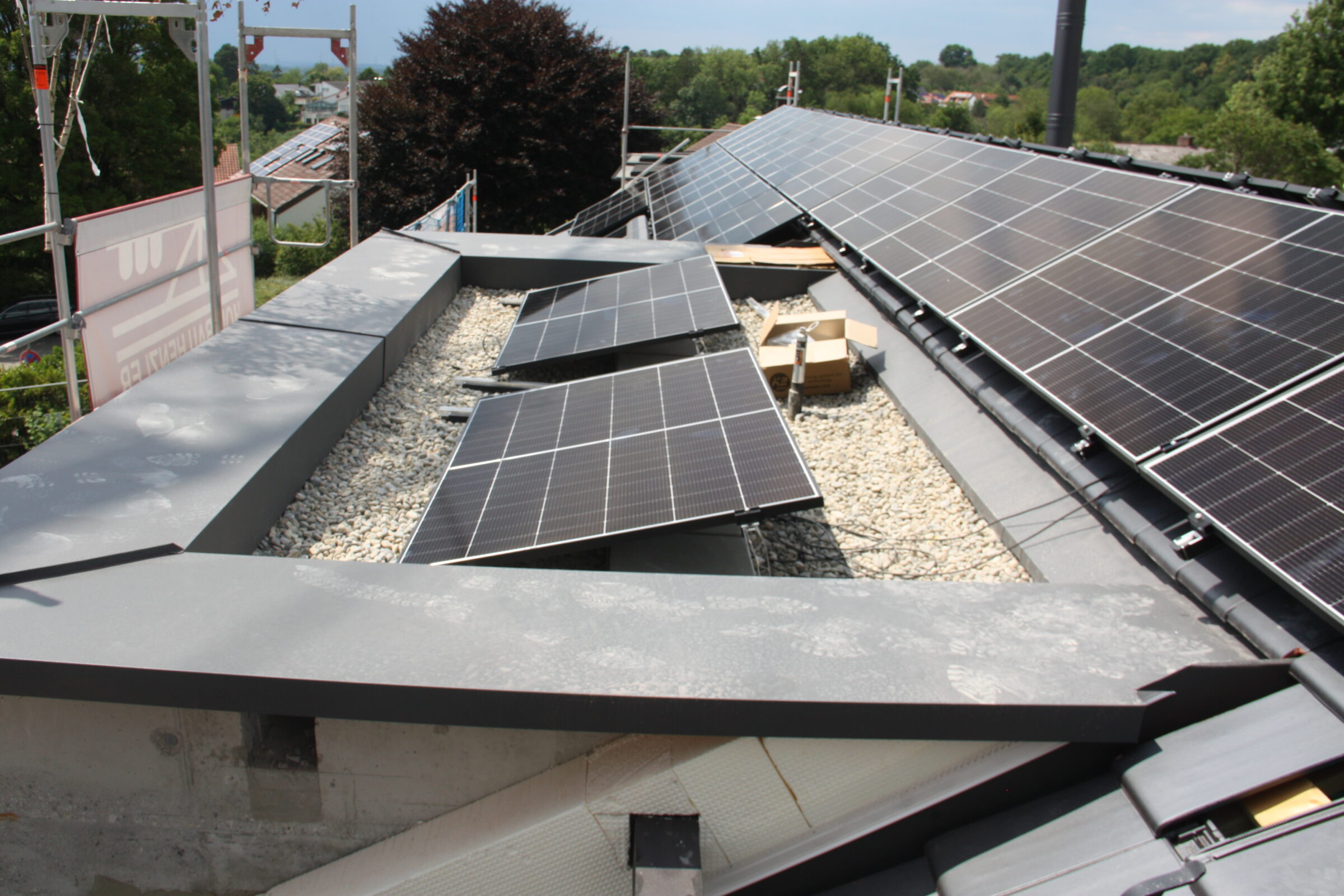 Besonders hervorzuheben ist die durchdachte Modulanordnung: Die Belegung erfolgt sowohl auf der Süd- als auch auf der Nordseite des Daches – einschließlich aufgeständerter Flachdachmodule mit 15° Neigung. Diese Nord-Süd-Ausrichtung wurde auf Grundlage einer positiven Cashflow-Analyse bewusst gewählt und optimiert die Erträge in Relation zur Investition, indem sie die Tagesverteilung der Solarstromproduktion sinnvoll erweitert.